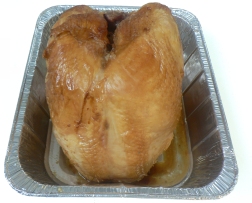 A roasted turkey, any size, cooked, sliced and ready to re-heat. Comes with gravy.